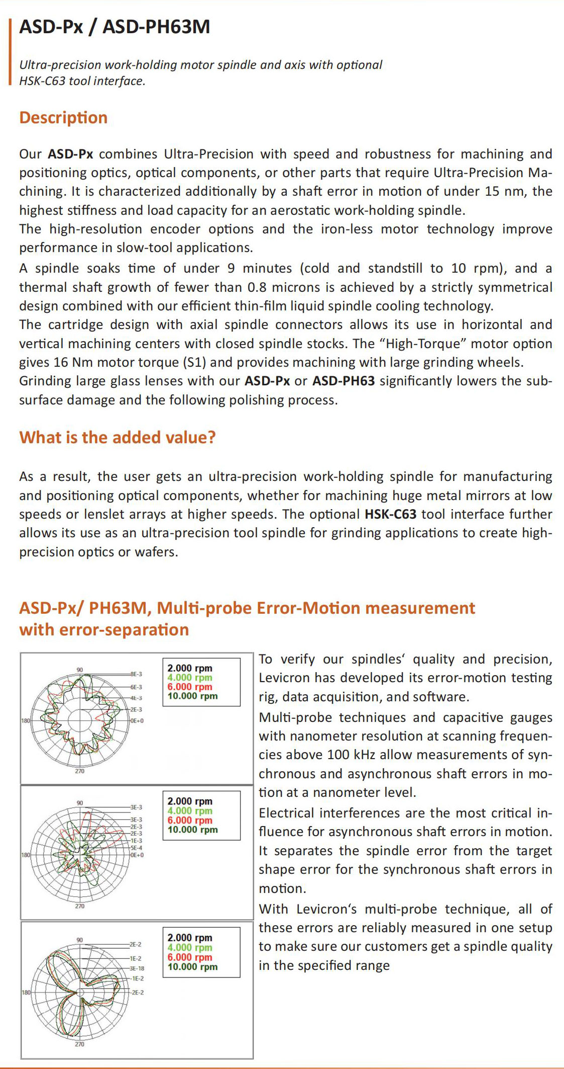 邁璞光電提供Levicron ASD-Px / ASD-PH63M主軸,適用于各種超精密車床加工應用,主要加工超精密零件。我們的Levicron主軸采用先進的技術(shù),具有高轉(zhuǎn)速、高精度和高穩(wěn)定性的優(yōu)秀特性。歡迎訪問我們的網(wǎng)站了解更多詳情