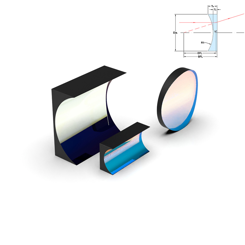 平凹柱面鏡又稱為負(fù)柱面透鏡,由一個(gè)平面一個(gè)凹柱面組成,其焦距為負(fù),常用于將平行或發(fā)散光束聚集到線上或改變像的寬高比;通過(guò)鍍反射膜可以實(shí)現(xiàn)平凹柱面反射鏡。