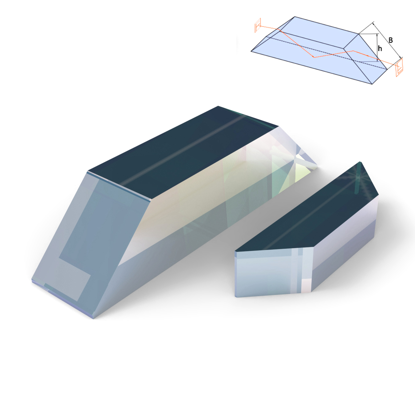道威棱鏡可以被認(rèn)為是頂端被切除的直角棱鏡,這樣就減輕了棱鏡的重量和雜散光的內(nèi)部反射。它們?cè)谟糜跁?huì)聚光束時(shí)會(huì)引入像散,所以我們建議用于準(zhǔn)直光束。此外,這些棱鏡還會(huì)影響透射光束的偏振態(tài)。