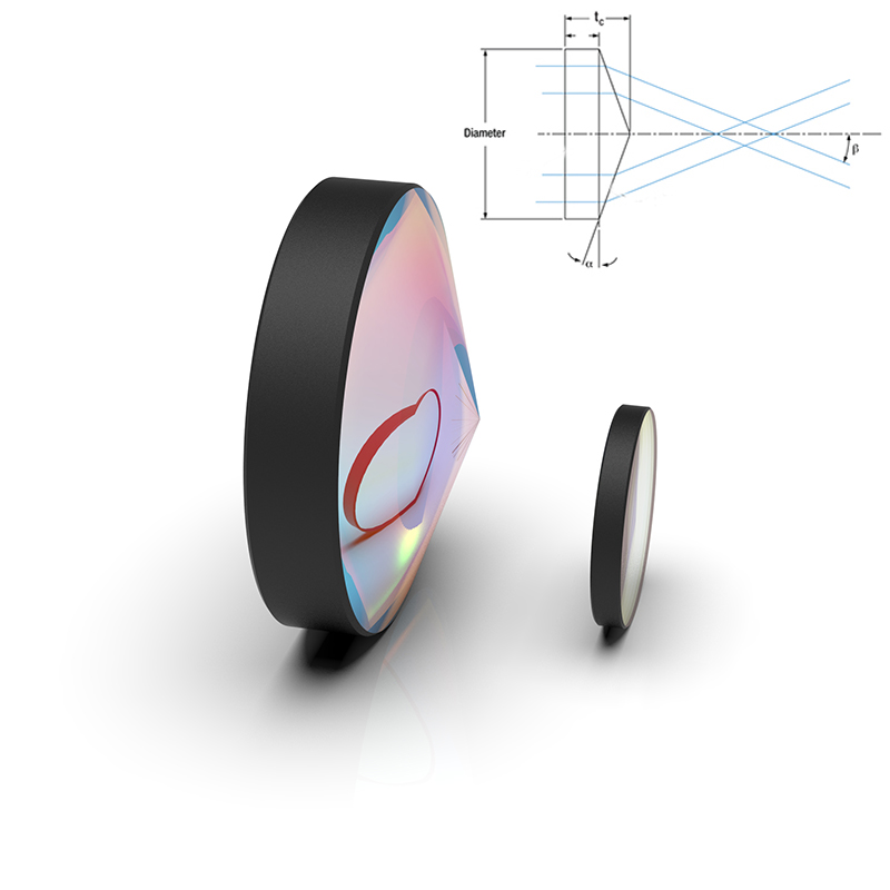 由于錐形透鏡的圓錐形狀,可以在軸棱鏡的幫助下生成環(huán)形光束輪廓。環(huán)形光束的直徑取決于角度,并隨著軸棱鏡和焦平面之間距離的增加而增加。 錐型透鏡主要用于光束整形和各種激光應(yīng)用。它們還可用于生成非衍射的類貝塞爾光束。一個(gè)具有幾乎恒定強(qiáng)度分布的區(qū)域,其長(zhǎng)度由軸錐的角度和直徑定義,在這里很有趣。貝塞爾光束非常適合醫(yī)學(xué)、研究和計(jì)量應(yīng)用。通過組合多個(gè)軸棱鏡或透鏡,可以生成各種光束輪廓,例如準(zhǔn)直環(huán)形光束或可變環(huán)形焦點(diǎn)。
