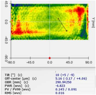 通過加工后有效口徑內(nèi) Luphoscan 檢測精度PV=0.145 λ , PV 99 =0.091 λ ,RMS=0.016 λ,粗糙度達(dá)到Rq=0.35nm。